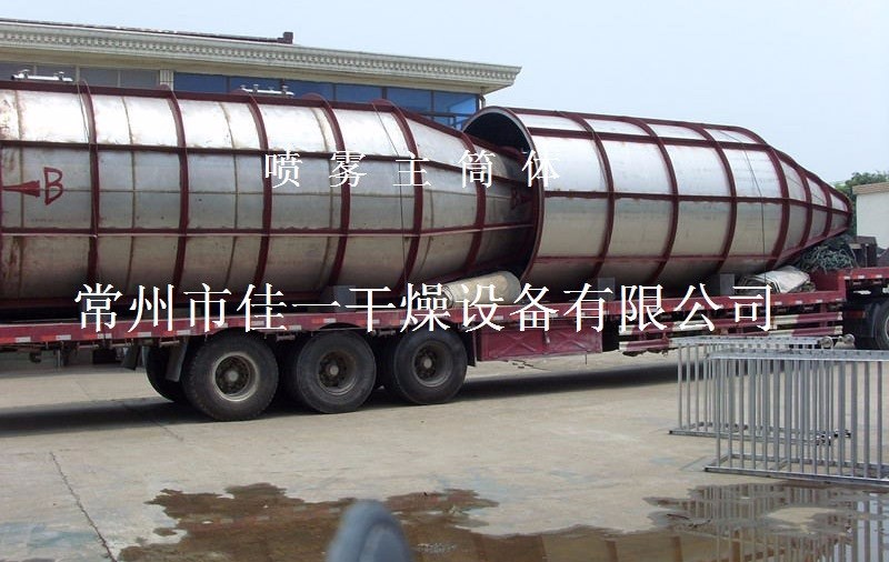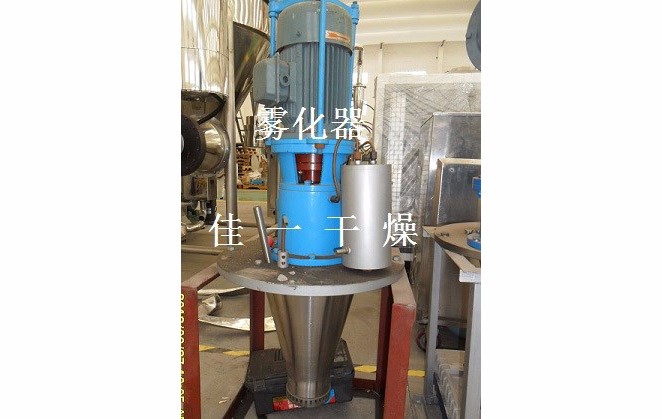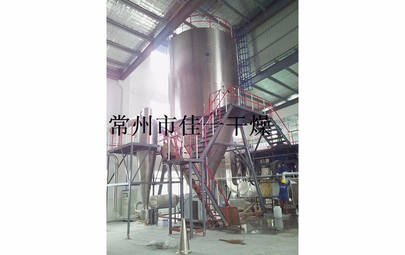 空氣經(jīng)過濾和加熱,進入干燥器頂部空氣分配器,熱空氣呈螺旋狀均勻地進入干燥室。料液經(jīng)塔體頂部的高速離心霧化器,(旋轉(zhuǎn))噴霧成極細微的霧狀液珠,與熱空氣并流接觸在極短的時間內(nèi)可干燥為成品。成品連續(xù)地由干燥塔底部和旋風分離器中輸出,廢氣由風機排空。